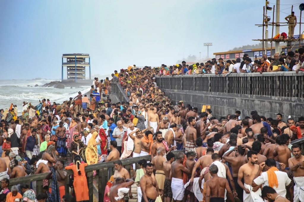 तमिलनाडुको कन्याकुमारी त्रि-समुद्री स्थलमा ‘आदि अमावस्य’ को अवसरमा आफ्ना पुर्खाहरूलाई श्रद्धाञ्जली अर्पण गर्न मानिसहरू भेला हुन्छन्।